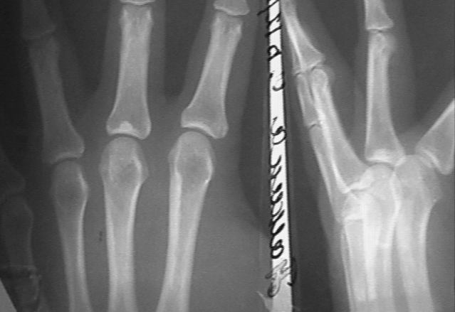 У больной П 30 лет появились боли 3 месяца назад в области пальца. В течении последнего месяца появилось образование. При осмотре на ладонной поверхности 3 го пальца на уровне межпальцевой складки пальпируется образование 03*04 см плотное болезненное. Сделана рентгенограмма. Мной расценено, что у больной имеется два заболевания: 1) Фиброма пальца 2) Остеома? основания основной фаланги случайно найденная. Планируется иссечение фибромы с гистологическим исследованием. Повторное рентгенологическое исследование через год. Уважаемые коллеги, как по вашему мнению поступить с костным образованием фаланги?Сергей Зырянов ЦРБ Новосибирская область г Куйбышев < | >