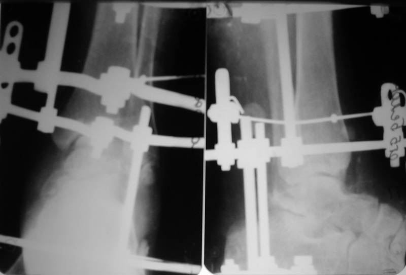Что сделали. Под наркозом попытка закрытой ручной репозиции - безуспешно. Латеральный доступ, открытая репозиция таранной кости. Наложение АВФ (2 кольца, 2 полукольца на пятке и переднем отделе стопы). Устранение подтаранного вывиха стопы. Послеоперационные снимки в приложении.