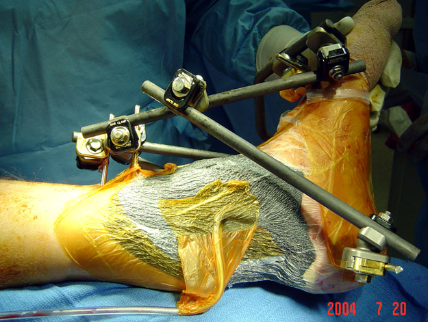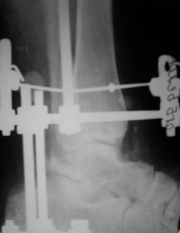 Predvaritelno nalozhit Spanning ExFix, dva 5mm Steinman pin za piatku i verkhnii metaphis tibia. Esli net ExFix obyishnyi apparat Ilizarova iz dvukh kolets