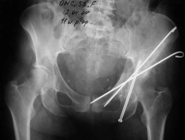 Откровенно говоря, репозиция оказалась очень непростым делом, несмотря на то, что при расширенном илео-феморальном доступе все переломы как на картинке.