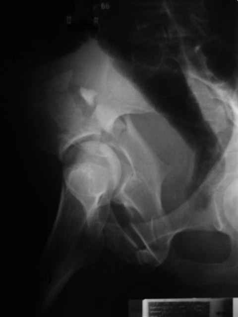 На рентгенограммах - высокий двухколонный перелом вертлужной впадины с нарушением конгруэнтности, имеется обратная клиновидность суставной щели.
