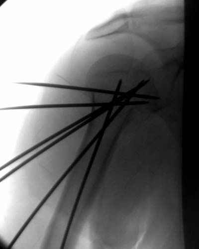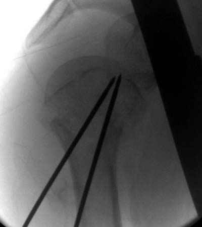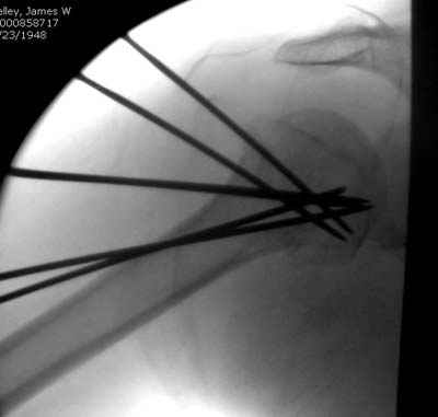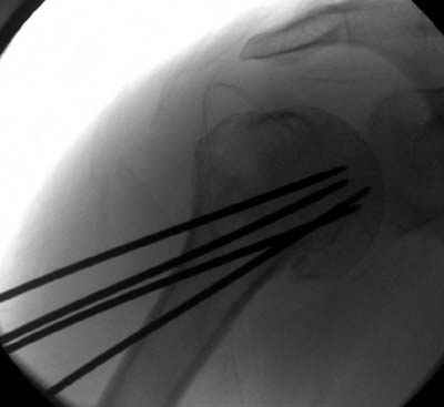 Здесь случай перелома-вывиха плеча, больному 56 лет, после "дважды" закрытой неудачной репозиции, опять же ургентно взяли в операционную, после полного общего обезболивания попытались сделать репозицию, и фиксацию провели спицами.