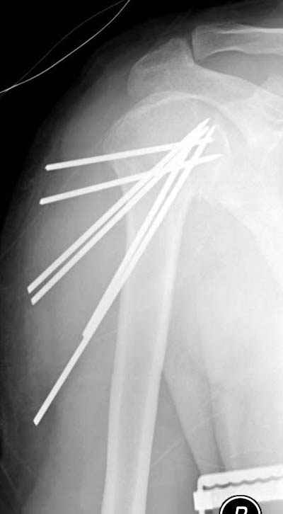 Больной находился в повязке, примерно напоминяющей косыночную, рекомендованы движения в локтевом суставе и маятниковые движения в плече, спицы удалены в три недели (были случаи миграции)