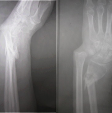 Due to so many other injuries sustained by him, this has been inadequately treated and he has ended up today like this. Very prominent distal ulna and a mobile fracture distal radius. No infection. Wrist flexion, extension fully free and so also the fingers. He has a good grip too. He wants correction of this deformity. I have opined as follows. Exfix with two pins in the distal radius and two proximally. Distract gradually till the DRUJ is properly aligned. 1)If one is lucky some bone would have formed in between which may be good enough. Continue ExFix till it is solid. 2) If we find that no bone is forming by 2 weeks, we can distract a bit faster Once the DRUJ is aligned and there is gap left, we can put in a small piece of fibula under tension and continue the ExFix till it is consolidated. If one is used to, a plate can be used to fix the radius along with the graft. This will shorten the ExFix time Suggestions are welcome V M Iyer . Iyer Orthopaedic Centre, 103,Railway lines Solapur India