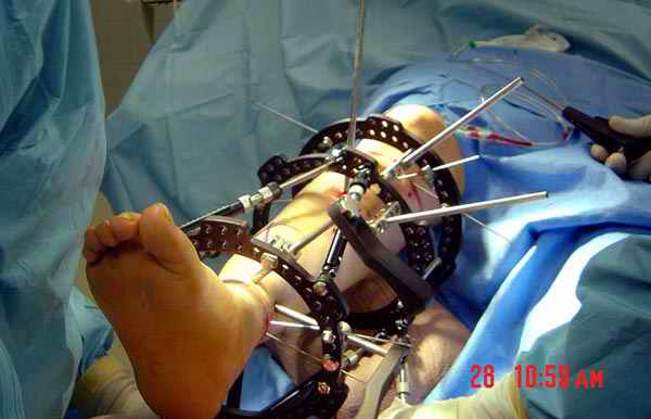На слайдах (не четко обозначены бедро и голень): на бедре по наружно-передней поверхности, между вастус латералис и прямой головками, а на голени по передне-медиальной поверхности, желателен подбор длины резьбовой части стержня по ширине поперечника кости. На снимке: дистальное кольцо, метод проведения стержня через канюлю-проводник.