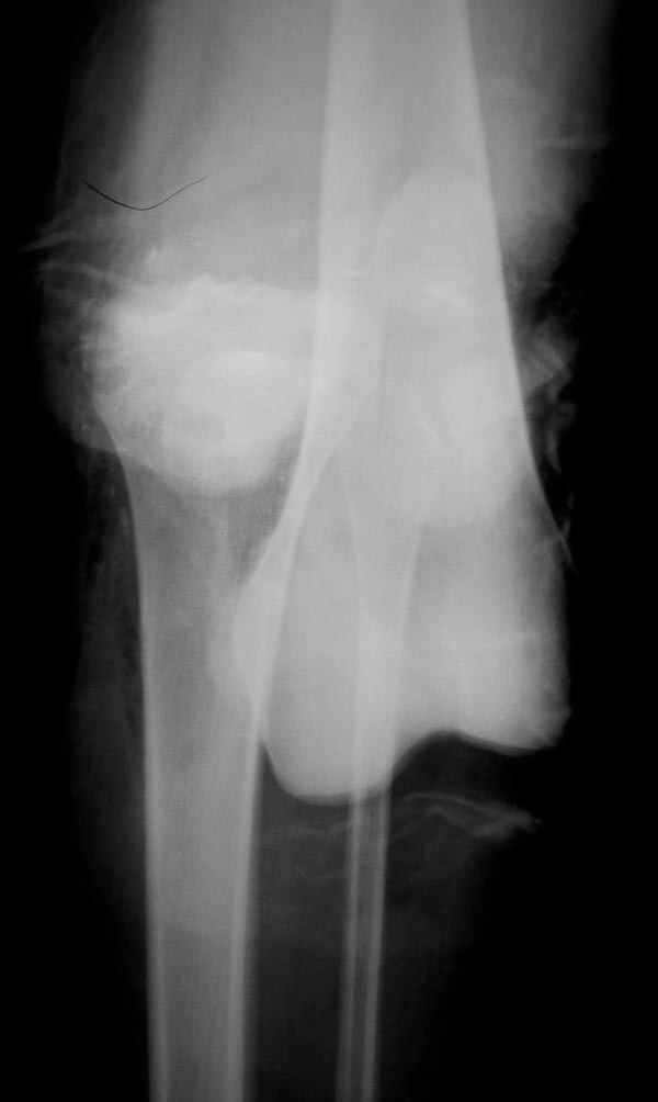 Во втором случае разрыв мягких тканей проходил через середину колена (по типу доступа Текстора), надколенник, в виде двух интралигаментозных скоплений мелких осколков. Его удалили, связку сшили с небольшим (до 3 см)укорочением в виде дупликатуры из которой сформировано подобие надколенника. Вели в аппарате Илизарова. Через 1,5 мес сняли. Колено пациент разработал до 80 градусов сгибания, разгибание полное. Нестабильности внешне нет. От предложенной пластики крестообразных связок отказался.