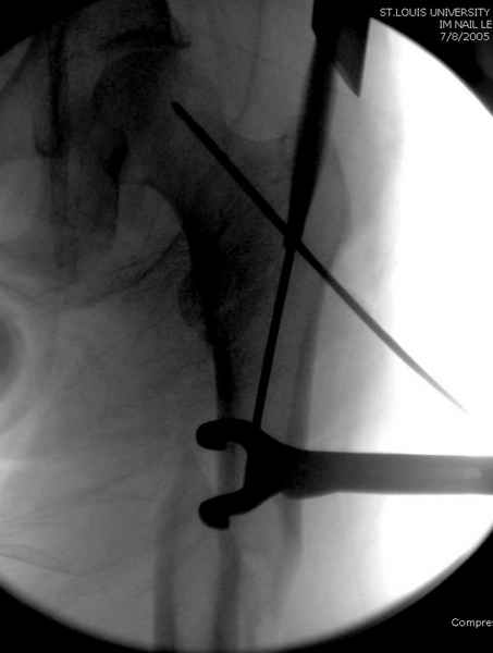 Как раз недавно у меня был примерный случай: больному 36 лет, поступил ночью, травма в результате мотоциклетной аварии, кроме чрезвертельного и спирального перелома левого бедра имеется переломы костей предплечья с этой же стороны. Скелетное вытяжение, а на следующий день больной про оперирован на ортопедическом столе с дистракцией. Чтобы не расколоть чрезвертельный перелом провели временную спицу ближе к переднему кортексу, из малого разреза костодержатель для репозиции, а фиксацию провели антиградным штифтом. Этапы операции на снимках.