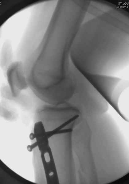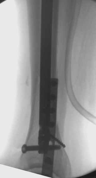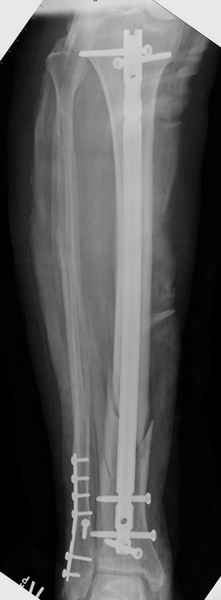 При такий спирали задний край tibia может быть сломан - нет ли этого в данном случае? На всякий случай можно было ввести 1-2 винта 4,5 мм спереди назад мимо гвоздя. Хотя самый дистальный блокирующий винт, возможно, зацепил этот отломок. А какой тут диаметр гвоздя и locking винтов?