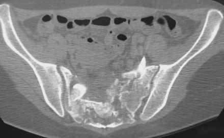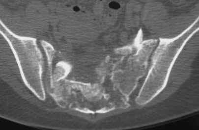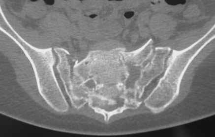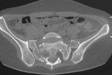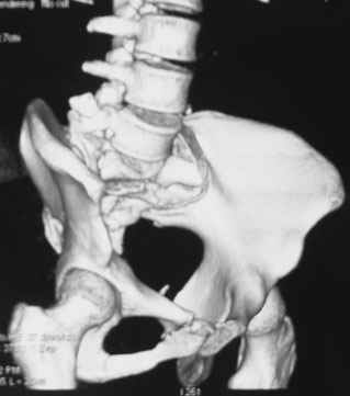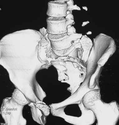 В отделение детской ортопедии нашей больницы поступила больная 17 лет. Травма 21.августа 2005г. На девочку в лесу упала береза. Доставлена в ближайшую ЦРБ. При поступлении установлен диагноз: Травматический шок 2-3 ст. Тупая травма живота. Забрюшинная гематома. Перелом костей таза с нарушением целостности тазового кольца. Перелом лонной и седалищной костей справа. Перелом поперечных отростков L3 - L5. Разрыв КПС справа. При поступлении выполнена диагностическая лапароскопия — выявлена обширная забрюшинная гематома. Было наложено скелетное вытяжение за бугристости обеих б/берцовых костей, больная уложена в гамак. Через неделю скелетное вытяжение демонтировано, гамак снят. Девочка уложена в положение «лягушки». Контрольные рентгенограммы через 4 недели после травмы. Заподозрен перелом дужки L5. Больная 26 сентября 2005 г. переведена в областную больницу в отделение детской ортопедии. При поступлении в локальном статусе: пальпация и перкуссия остистых и поперечных отростков L4-5 болезненная. Пальпация костей таза б/болезненная. С-м натяжения слабо положителен. Осевая нагрузка положительная. Движения в т/б суставах ограничены, болезненны. C-м прилипшей пятки отрицательный. C-м Ларрея и Варнейля отрицательный. Периферическая гемодинамика не нарушена.Неврологический статус: вторичная двусторонняя радикулопатия L5-S1. 29 сентября произведена компьютерная томография позвоночника и таза. < | >