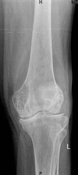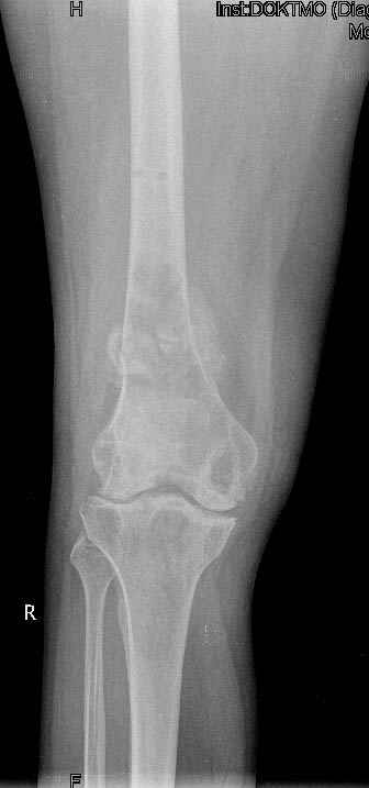 Коллеги!Окажите, пожалуйста, консультативную помощь.Мужчина, 41 год, 15 лет состоит на учете по поводу ревматоидного полиартрита, гормонзависимый (преднизолон получает нерегулярно). В процесс вовлечены крупные и мелкие суставы. 01.01.06 - без травмы наступил патологический перелом на границе н/3-с/3 бедра (перелом на фоне кистозных изменений?) Биопсия из зоны перелома - <реактивные изменения в очаге перелома>, без признаков опухоли. На рентгенограммах, помимо перелома, кистозные изменения на мыщелках б/берцовой кости и мыщелке бедра с другой стороны. До травмы со стороный коленных суставов был болевой синдром, функция практически в полном объеме. Какие будут предложения по тактика лечения перелома и кист на противоположом бедре? Заранее благодарю! С уважением, А.В.Владзимирский Донецкий НИИ травматологии и ортопедии Донецк, Украина