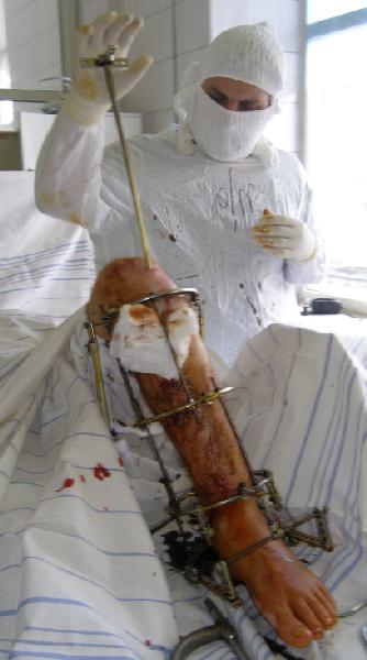 Аппарат был снят окончательно только после введения стержня, то есть оставалось по одной спице в проксимальном и дистальном метафизах большеберцовой кости, спицы в пятке. Фото во время рассверливания в приложении.