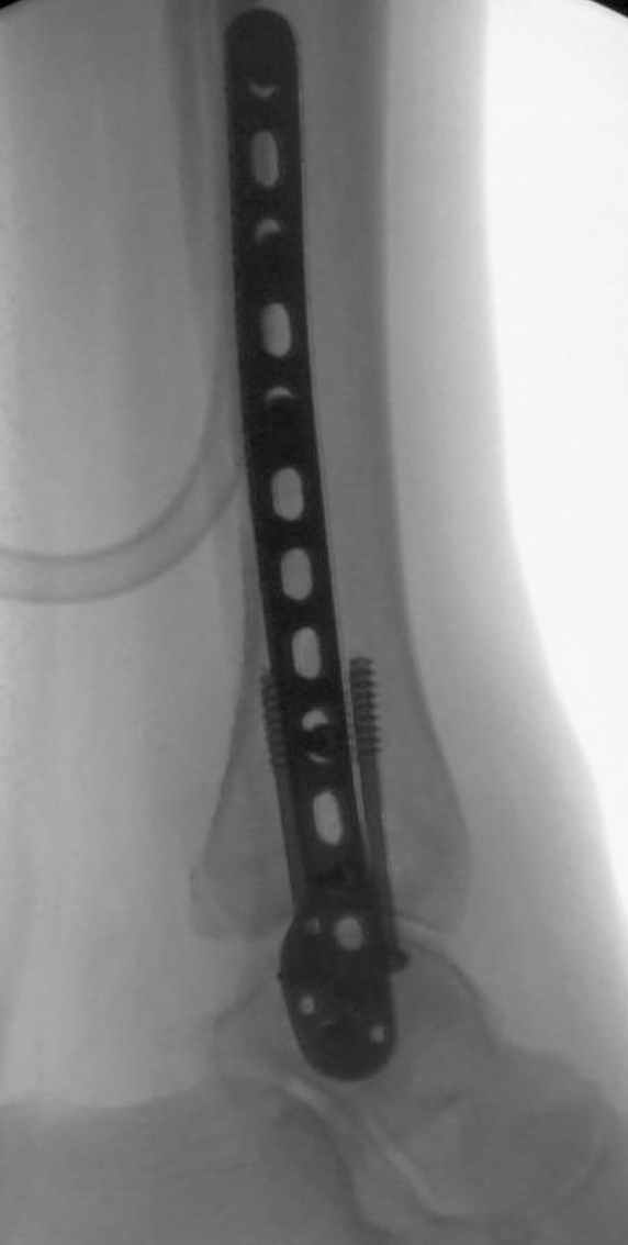 пластину (соединили дистальный конец с диафизом не трогая место перелома) и медиально перкутанно