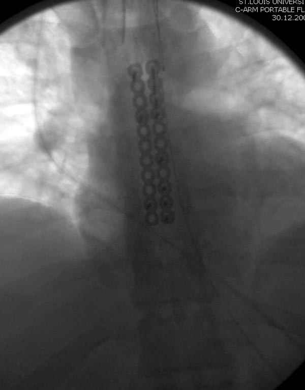 Ложный сустав зафиксирован двумя пластинами 2.4 мм (locking plate) позаимствованными из челюстно-лицевой хирургии, с костной пластикой, все остальные пластины мне показались слишком толстыми, грубые для грудины или отсутсвовали возможности создания угловой стабильности.