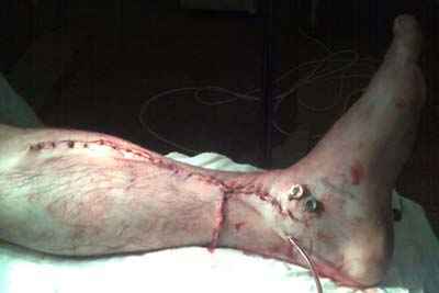 После совместного осмотра с зав.отд.микрохирургии пациент госпитализирован в клинику микрохирургии. Дежурными врачами этой же клиники принято решение сохранить конечность, выполнены ПХО, фиксация спицами, гипсовая иммобилизация. Результаты - см.приложение.