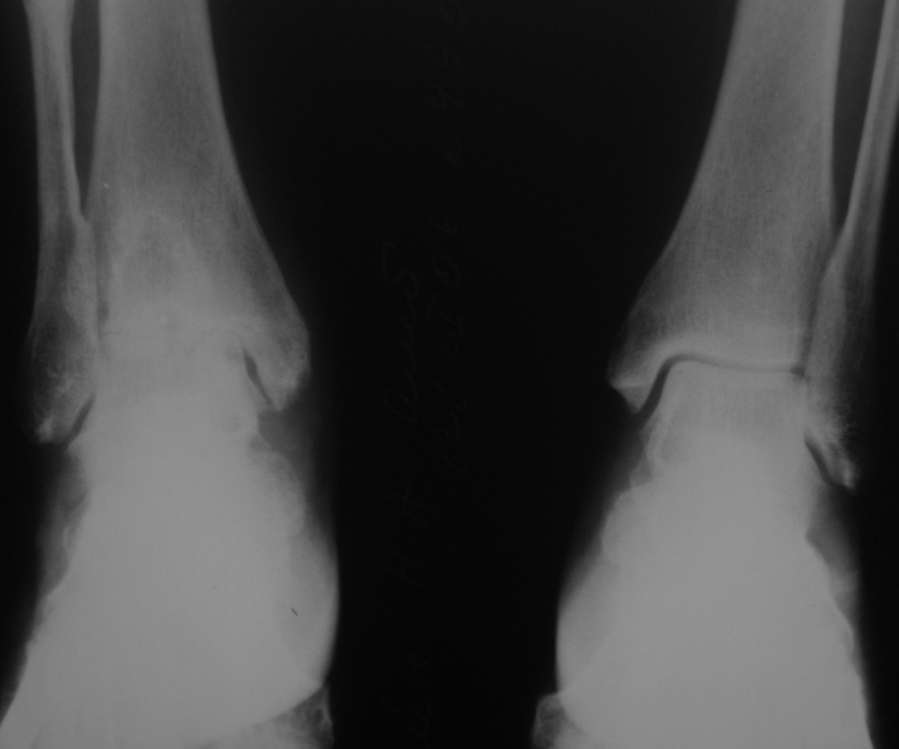 Артроз, во-первых, вследствие неконгруентности суставных поверхностей - имеется укорочение малоберцовой кости; во-вторых имеется синостозирование берцовых костей (вместо тугоэластисчного синдесмоза).
