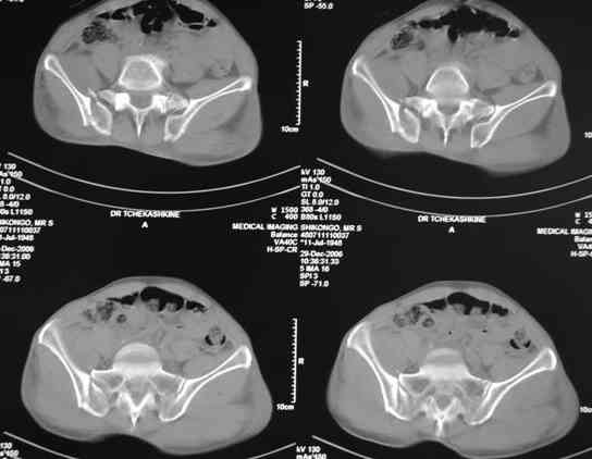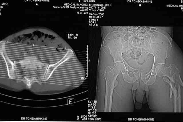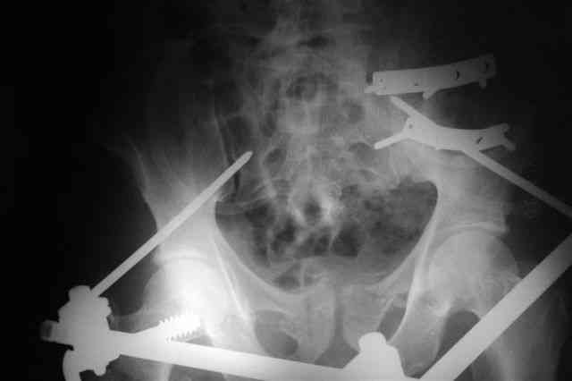 Попытка низвести половину таза на тракционном столе ( скелетное вытяжение за бедро) безуспешная.