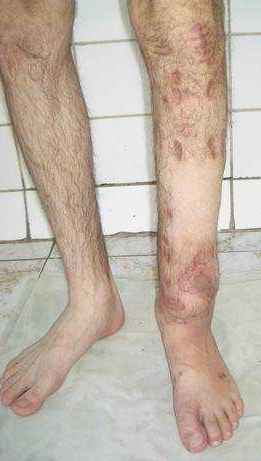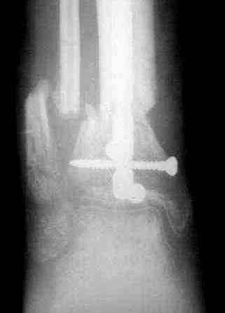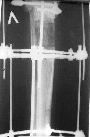 3,4 - через 4 недели наложен спице-стержневой аппарат, произведена остеотомия большеберцовой кости в верхней трети, раны зажили, проводилась дистракция в аппарате.
