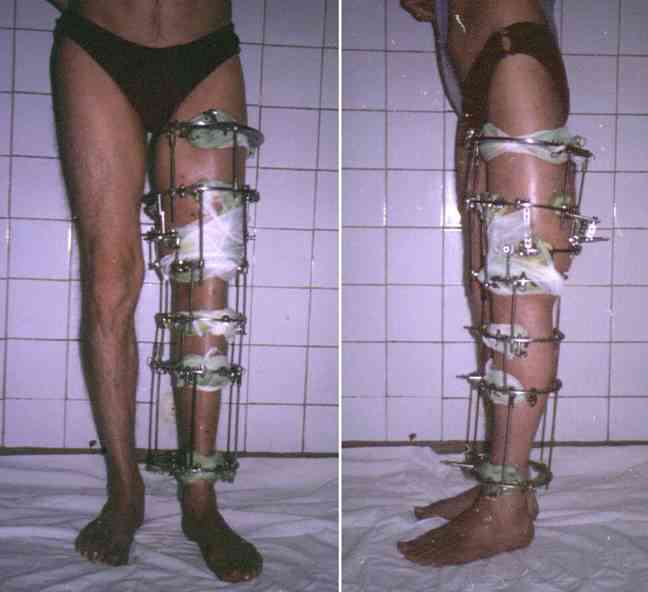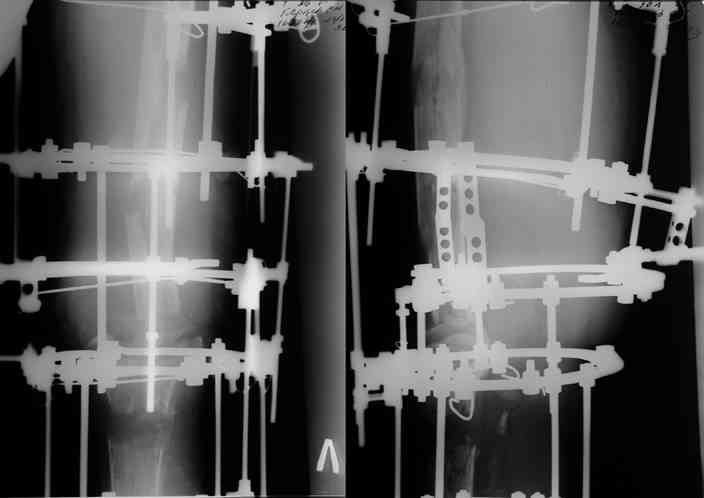 Прикрепляю пример замещения дефекта бедра 20 см, после резекции по поводу опухоли, эндопротеза Сиваша, вялотекущего остеомиелита со свищами в течении 3 лет. Получилось хорошо и всего за 6 месяцев в аппарате. Колена не было. У Вас случай сложнее. Это было в 1998г. Я работал в ЦИТО и у меня было 4 больных, я занимался им с утра до ночи. Сейчас 60 больных и операций в нашем отделении 25-30 в неделю.Если могу чем помочь - нет проблем.