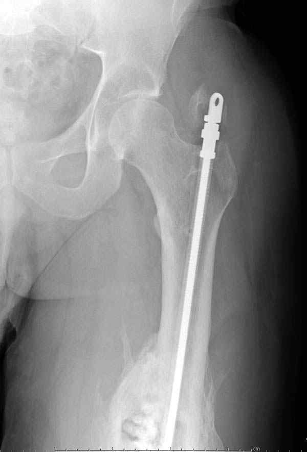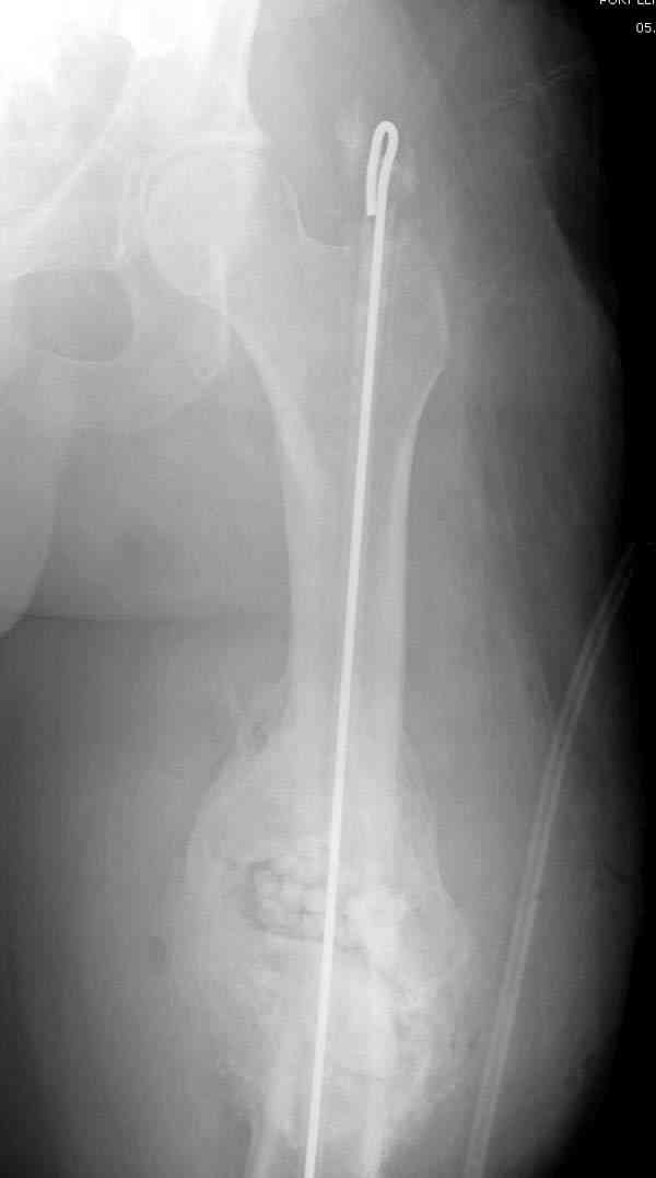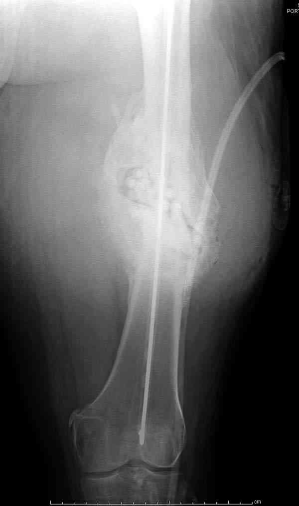 Недавний случай: год назад леченный интрамедуллярным гвоздем открытый перелом бедра инфецировался, многократные Irrigation&Debridment