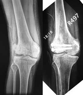 This 20 year old patient sustained a fracture in the lower end of the femur, one and a half years ago, with a compound wound over the fracture area. Notes at that time mention a compound fracture dislocation, with a loss of part of the lateral condyle. This was treated by debridement, and external fixation. After two weeks, the lateral condyle (coronal fracture) was fixed by a screw and k wire in an AP direction.