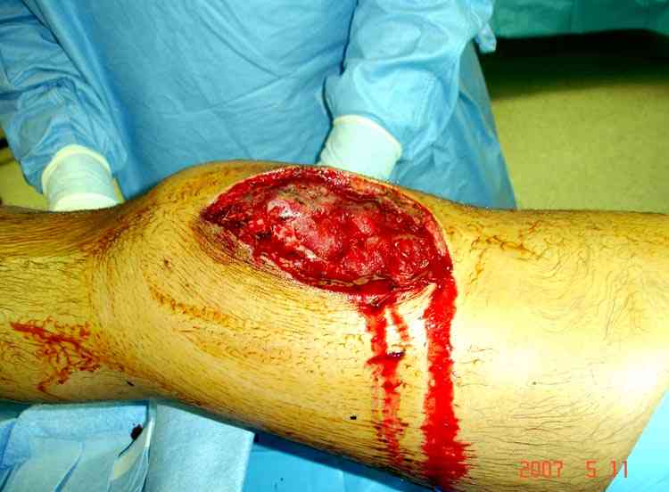 На 9й день с момента травмы ушили рану без натяжения. Больной получает реабилитацию, движения коленного сустава с помощи CPM-continuous passive motion machine. Сегодня выписан.