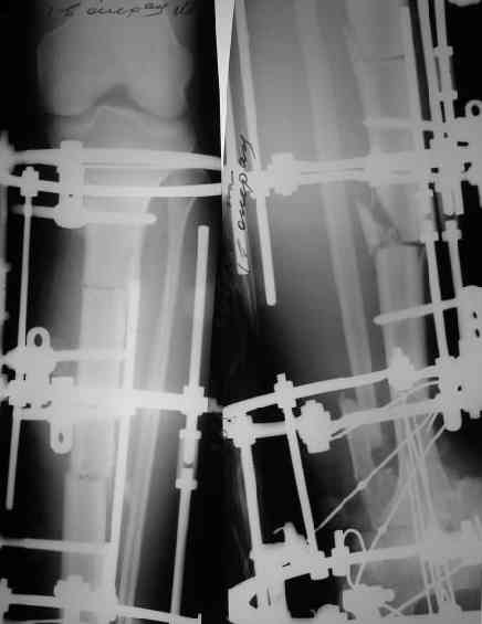 Александр! Обьясни, почему удлинение не сделать монолокально на уровне дистального метаэпифиза? Ведь укорочение небольшое и голеностопный сустав все равно фиксирован. Как то не симпатично выколот диафиз.