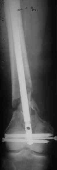 Удалили ластину без проблем. Выявилась значительная подвижность. В этих условиях сразу пропала мотивация к постепенной коррекции аппаратом. Попробовал восстановить длину, введя между отломками spreader. Отчасти удалось. Тогда защили рану, наложили спицевой дистрактор (2 спицы в дистальный отдел и 1 вверху). после этого был убран и спонгиозный винт. И сделали антгерадное штифтование, как говорится, "по принятой в