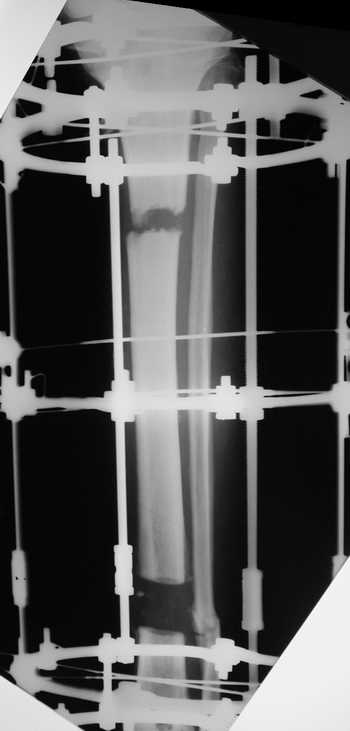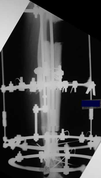 Женщина 46 лет, неудачно лечившаяся по поводу перелома голени в нижней 1\3 сначала в гипсе, поступила через 6 месяцев после остеосинтеза пластиной (рис 1). Имелась деформация в нижней 1\3 голени: варус, антекурвация, наружная ротация, два свища. Удалена пластина, дебридмент мягких тканей,
