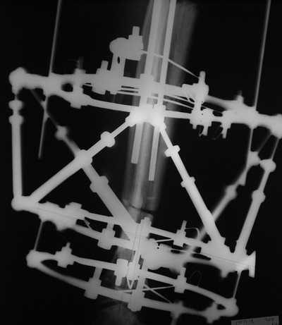 остеотомия м\б кости, аппарат Илизарова. По рентгенограммам в двух проекциях произведено планирование устранения смещений (рис 2 и 3), между вторым и третьим кольцом установлены 6 телескопических дистракторов Гесапода, данные введены в программу, и далее втечение 10 дней больная подкручивала телескопы согласно выданной компьютером инструкции. По завершению репозиции гексаподные телескопы обратно заменены на обычные штанги от аппарата Илизарова (рис 4 и 5). Еще через две недели забит гвоздь (рис 6, контроль
