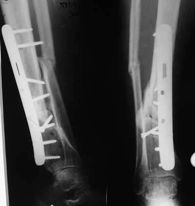 Женщина 46 лет, неудачно лечившаяся по поводу перелома голени в нижней 1\3 сначала в гипсе, поступила через 6 месяцев после остеосинтеза пластиной (рис 1). Имелась деформация в нижней 1\3 голени: варус, антекурвация, наружная ротация, два свища. Удалена пластина, дебридмент мягких тканей,