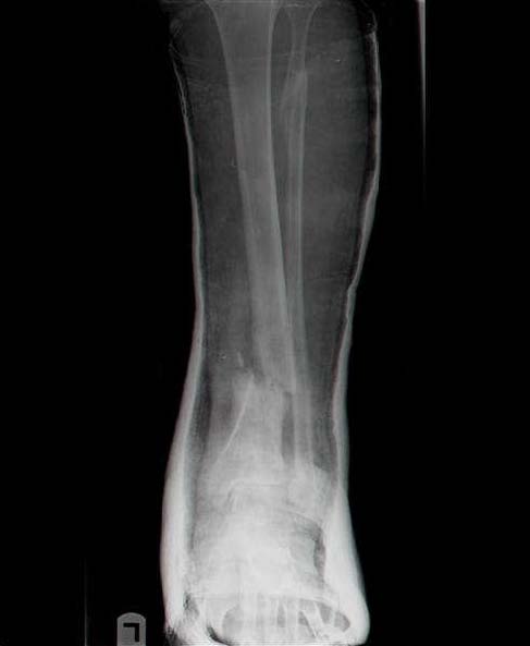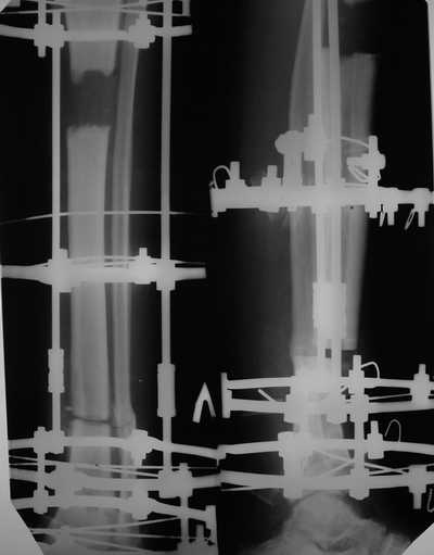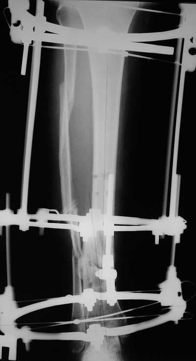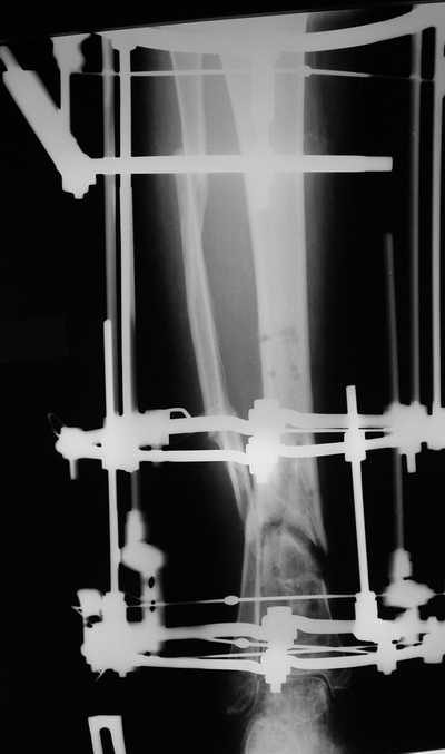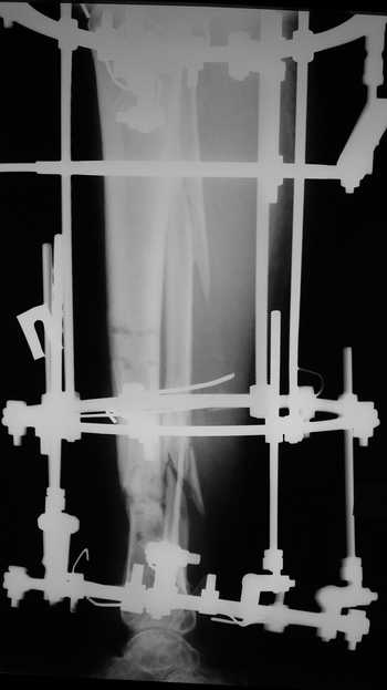 Male 54 years old, diabetic, blind in both eyes, with infected (MRSA) non union distal tibia after fracture 8 month ago. In acute phase treated by ORIF with LCP tibia and fibula. Treatment complicated by infection and after 6 month hardware was removed and treatment continued by cast fixation. You can see malposition of fragments In this stage beginning treated by Ilizarov fixation with use Hexapod system, allows anatomical position of fragments and you see signs of union.