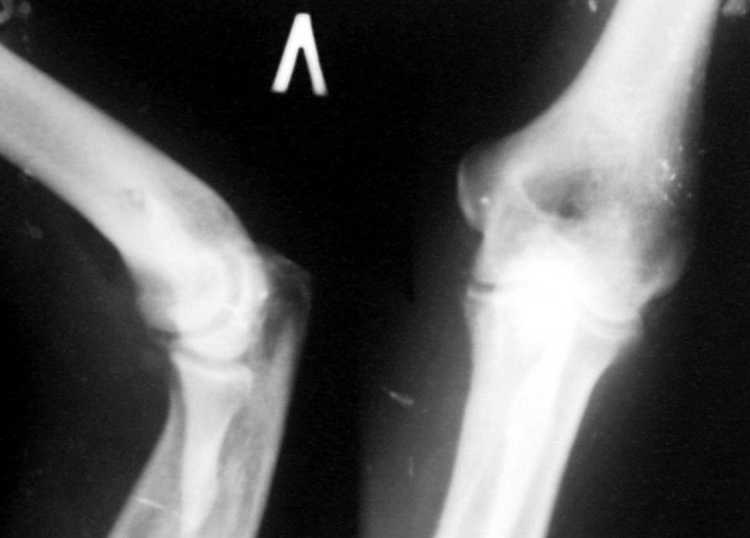 Dear colleguaes! I almost sure this elbow after dislocation and clouse readuction treatment.Despite pure quality of x-ray picture