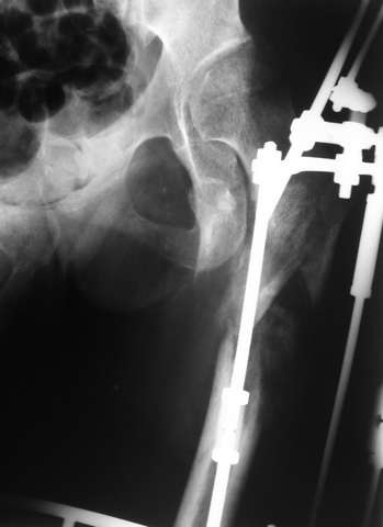 Мы закончили репозицию отломков бедренной кости в аппарате (рис. 1, 2) у нашей пациентки и на прошлой неделе сделали ей вторую операцию. Штифт удалось ввести закрыто. Верхний шеечный винт держался очень плохо, поэтому мы его убрали и решили не ставить. Нижний держал очень плотно. Рентгенограммы после операции прилагаю (рис. 3,4). Пока не получилось сделать нормальный аксиальный снимок (больная с трудом сгибает и отводит ногу в тазобедренном суставе). Пока сделали боковую проекцию в положении на здоровом боку со сгибанием здоровой ноги.