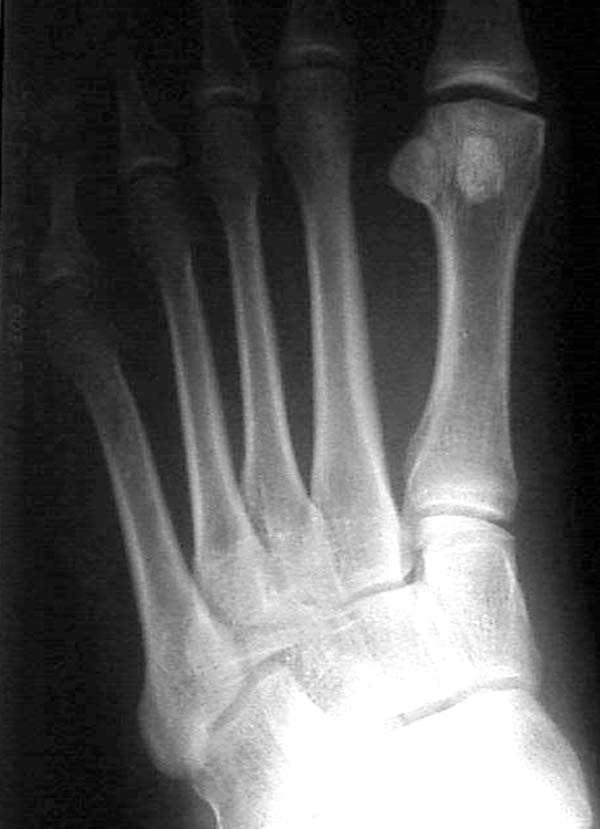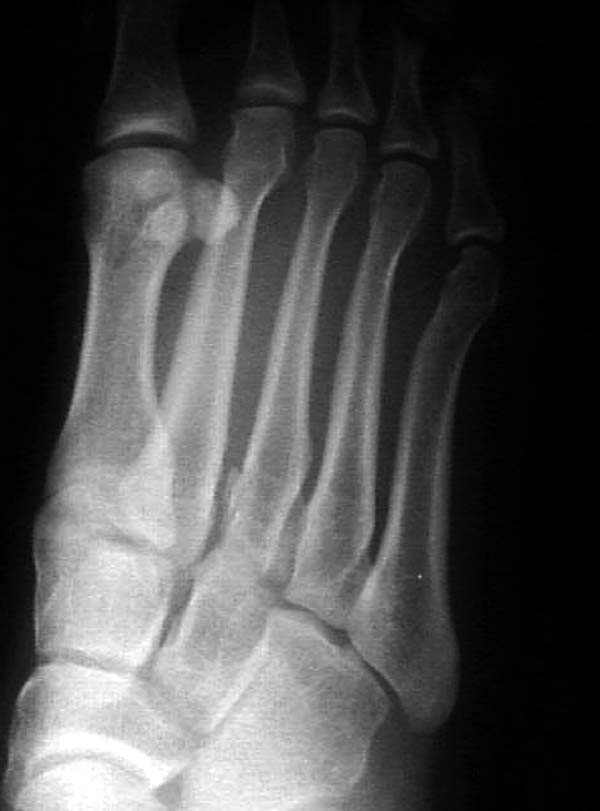 По первому снимку, не видя больного, мог бы заподозрить перелом основания 3-й плюсневой кости. Поэтому избрал бы тактику консервативного лечения, как при переломе плюсневых костей без смещения!