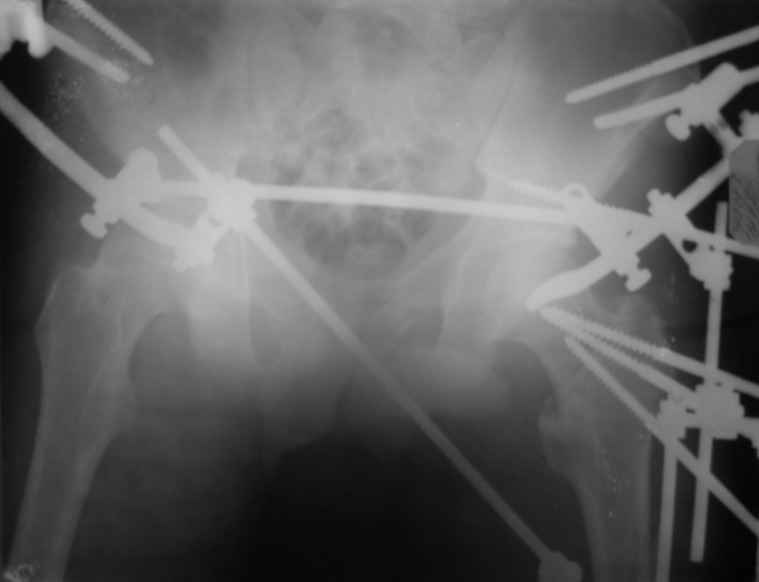 Кстати, если тазобедренный сустав безнадежно потерян, то можно по выведении длины и оси зафиксировать в аппарате дистальный отломок и только левую половину таза, освободив правую.