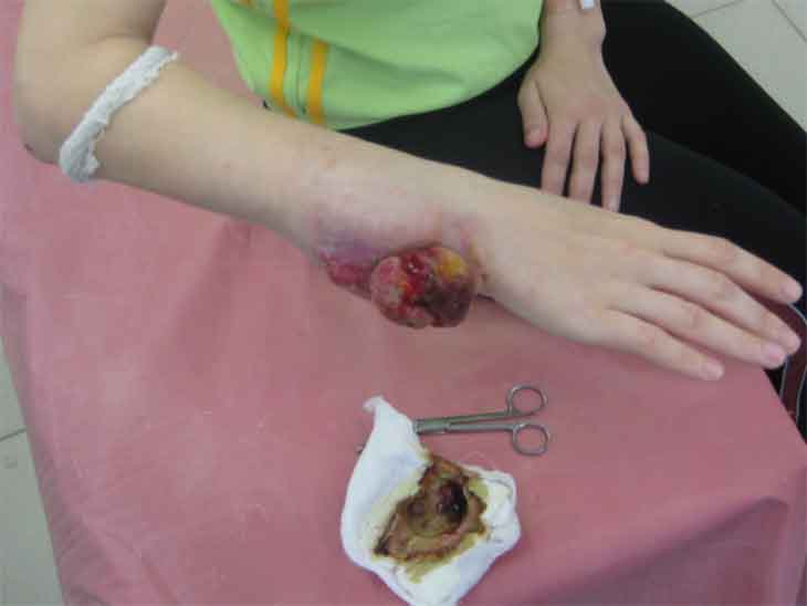 Незаживающая рана, по-моему, является последствием резекционной биопсии в условиях, когда кожа и мягкие ткани были натянуты над опухолью и буквально лопнули при прикосновении скальпеля.
