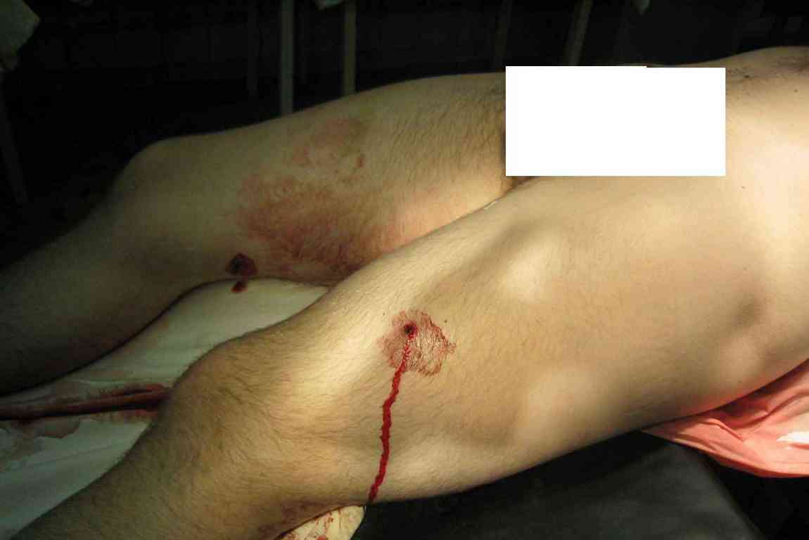 >>>ИМ: ПХО огнестрельных ранений с точечными входным и выходным отверстием без напряженной гематомы и повреждения элдементов сосудисто-нервного пучка не показано.