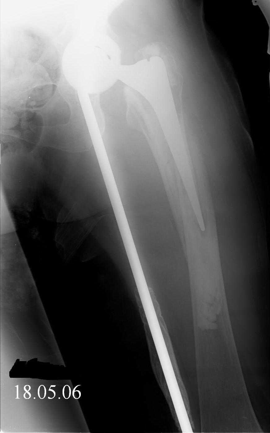 Мое мнение,что бедренный компонент эндопротеза нестабилен - медиальный кортикал бедренной кости полностью отделился от цементной мантии эндопротеза, нет уверенности в том, что цементная мантия бедренного компонента цела на всем протяжении, чаще, она подвергется растрескиванию, особенно при таком высокоэенергетическом переломе. Мое мнение, вданном случае показано ревизионное эндопротезирование с заменой бедренного компонента на ревизионноу ножку. Стабильность вертлужного компонента оценить трудно на данном снимке, но по моему она стабильна. Но я бы проверил это интраоперационного и взял бы на операцию и вертлужный компонент.