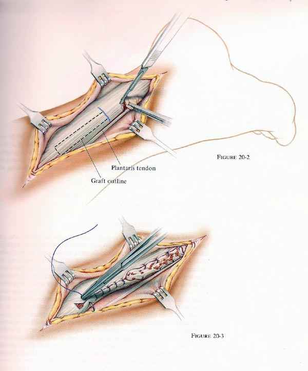 Например, в свежих случаях очень редко можно встретить чистый поперечный разрыв ахилла, там всегда разволокнение. Задача собрать концы вместе и ушить друг к другу, но без дополнительного усиления, такая методика имеет высокий процент рецидива. Для усиления существует различные алломатериалы, но я предпочитаю метод дупликатуры местным материалом, как показано на иллюстрации из книги по спортивной травме.