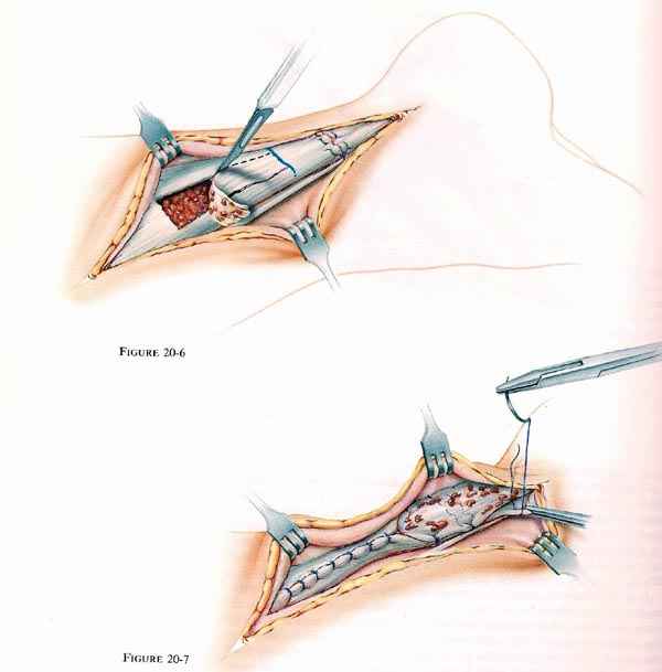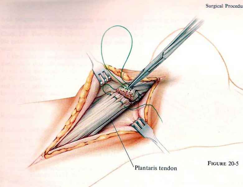 Делается косой разрез на фиброзной ткани потом сближаются концы здоровой части сухожилия и ушиваются (№ 2 Ticron или любой аналог Ethibond или Fberwire с иглами в двух концах) Для усиления шва как пластический материал желательно использовать фиброзную ткань, которая зашивается 2.0 Vicryl. (на снимке)