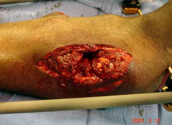 Уважаемые коллеги, Современная тактика лечения огнестрельных переломов вызывает споры. Опыты многих стран доказывает, что открытые переломы можно успешно лечить с применением внутренних металлических конструкций, включая гвозди. В западных странах более 25 лет эту методику применяют для лечения огнестрельных переломов. После применения адекватных методов по предупреждению осложнений, например, после промывания ран, огнестрельные переломы можно стабилизировать без боязни инфицирования. Здесь представлен больной 27 лет с ранениями, включая огнестрельный перелом большеберцовой кости. Стандартный аьгоритм: 11.08.09 доставлен в операционную, Irrigation&Debridment c фиксацией Наружным Фиксатором и вакуумирование VAC; службой травмы пройзведена ангиография с негативным результатом. (снимки 1-10) 14.08.09 повторная Irrigation&Debridment (чувстительственность из раны негативная) со сменой фиксации на медуллярный гвоздь и вакуумирование VAC 18.08 и 21.08.09 Irrigation&Debridment с сменой е VAC, после высеялся MRSA in thio т.е. на специальных срезах небольшое количество (11-13) 25.08.09 повторная Irrigation&Debridment. Пластик хирург не стал рисковать с Soleus flap из-за отечности, и применен Gastric flap, кожная пластика на медиальную и латеральную рану; аллографт из костных стружек с BMP. Поверхность вакуумирована VAC системой на 4 дня (14-16) Финальные снимки сделаем на днях. Djoldas Kuldjanov, MDDepartment of Orthopedic SurgerySt. Louis University Medical Center