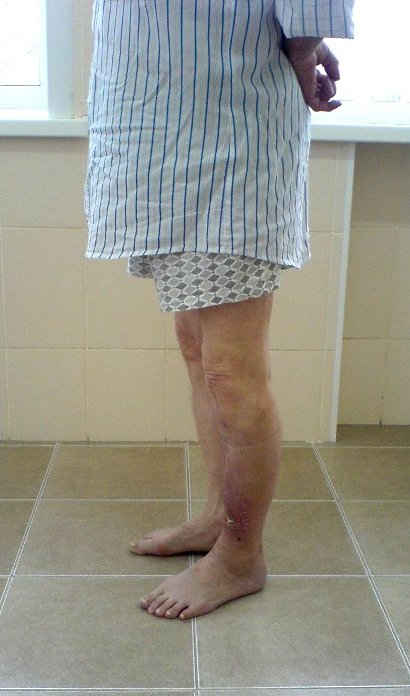 Тогда можно рассмотреть вопрос одновременного удаления штифта, мышечной (в данной области применим проксимально отсеченный лоскут камбаловидной мышцы) или микрохирургической (что более надежно) пластики дефекта мягких тканей, остеотомии проксимального фрагмента большеберцовой кости, остеосинтеза блокируемым штифтом с а/б покрытием, наложения простого аппарата Илизарова (можно из полуколец) для дистракции на штифте. При данном варианте пациент сохраняет возможность полной опоры на ногу, что очень важно для заживления у пожилого пациента) и отпадает необходимость в проведении дополнительный операций (при благоприятном развитии событий).