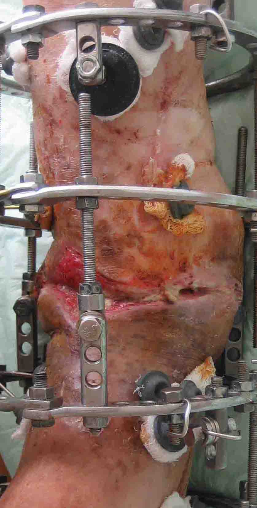 На операции резекция 8 см, внешний остеосинтез,одновременное сближение примерно на 4 см, а затем постепенное сближение до полного контакта в течение 3 недель. Рана с патологически измененными краями, имевшая на операции размеры примерно 4-5 на 10-12 см закрылась самостоятельно в течение примерно 2-х мес. Ну не самостоятельно, конечно, а с нашей помощью, но без пластики.
