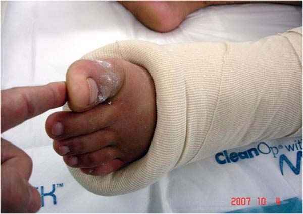 Клиническая картина - отсутствие чувствительности в промежутке между первым и вторыми пальцами стопы, а также неадекватно сильная реакция на боль при сгибательном и разгибательном движении первого пальца стопы - подтверждает подозрение на повышение давления в переднем компартменте.