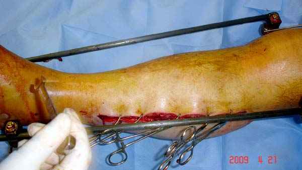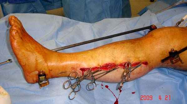 Оптимальный остесинтез внеочаговая фиксация, учитывая фасциотомный разрезы - стержневой аппарат.