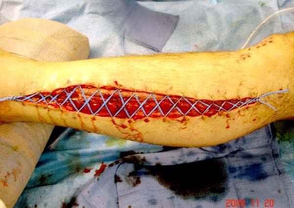 Нет специфического инструментария для фасциотомии, кроме обычного скальпеля и ножниц. Кожа разрезается снаружи и внутри, в зависимости от конечности, иногда разрез достигает 25-30 см. Из одного доступа ножницами вскрываются оба компартмента расширением ран проксимально и дистально.