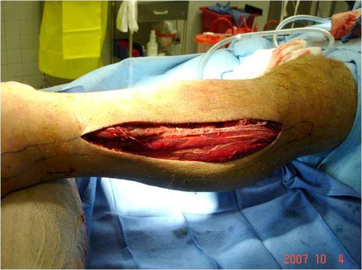 После доказательства и тщательной документации неблагоприятных проявлений, в операционной проводится фасциотомия. Желательно проводить вскрытия только заинтересованных компартментов, потому что наличие высокого давления с одной стороны не доказывает вовлечения в процесс другой стороны.