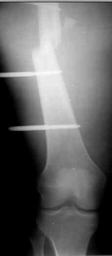 Если у Вас возникнут какие-то сомнения, то возможно наложение гибридного циркулярного-монолатерального дистракционного аппарата на левое бедро и выполнение остеотомии в в/3 бедра. Почему монолатеральный гибридный аппарат, а не аппарат Илизарова? Эта конструкция гораздо легче переносится пациентами, в ней гораздо удобнее проводить местное лечение ран.