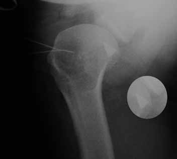Снимок сделан во время операции в положении бльного на спине - аксиальная проекция. Игольчате метки - передняя поверхность плечевого сустава в этом мете осуществлен доступ. Прямая проекция обрезана. Фрагмент рапологается по центру головки на самом краю снимка.